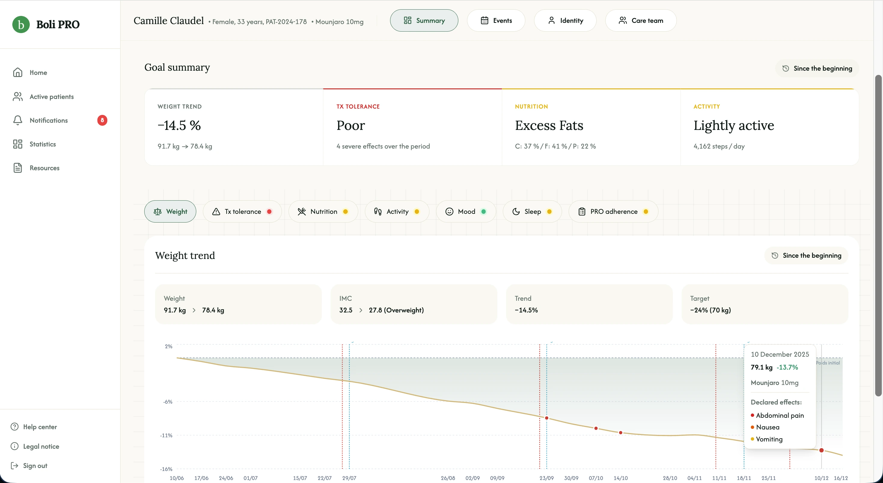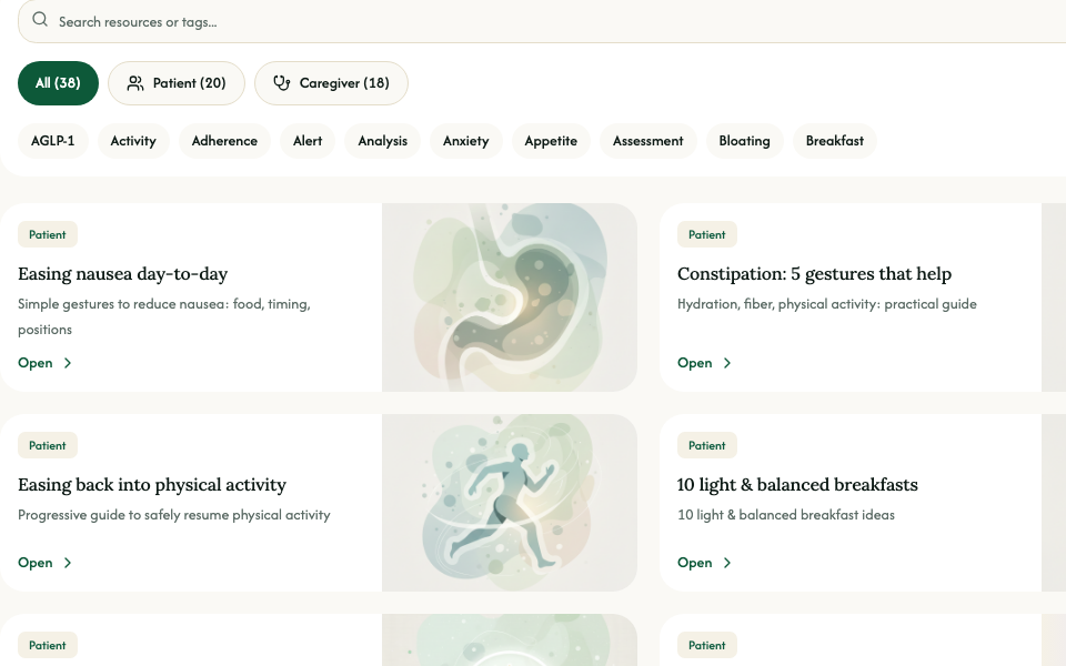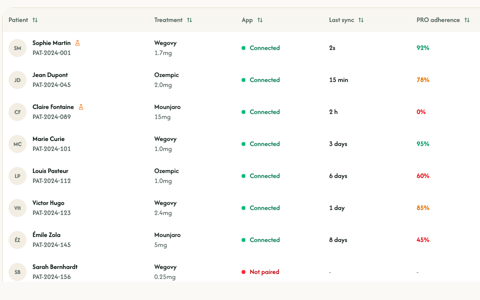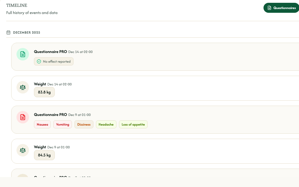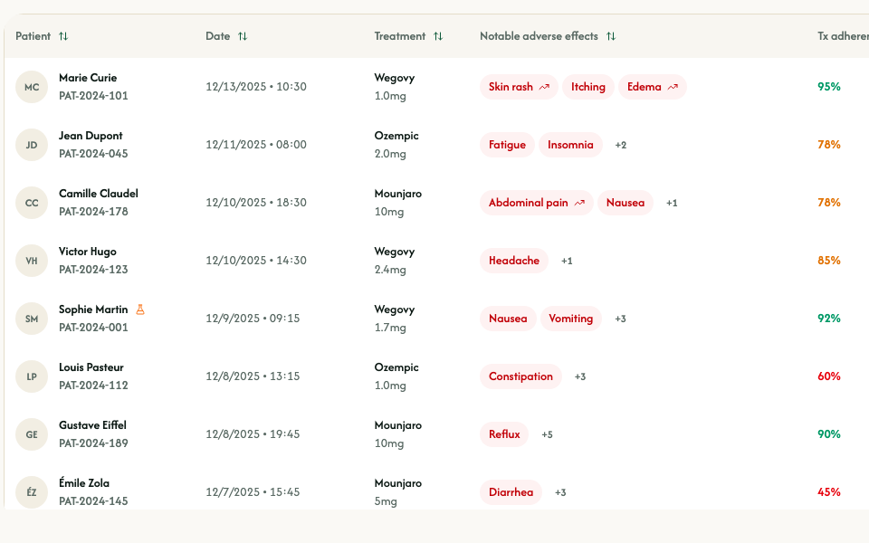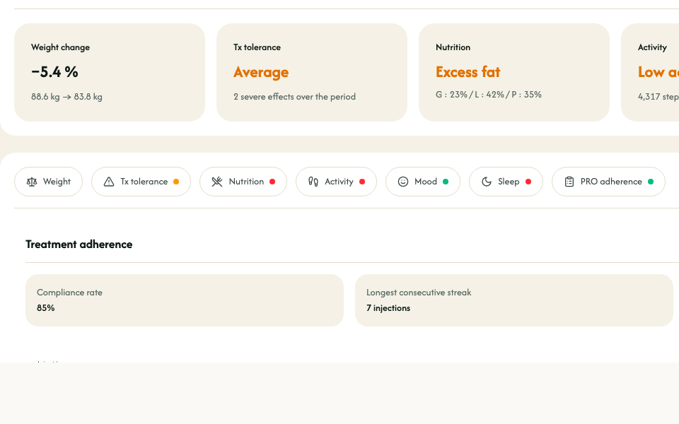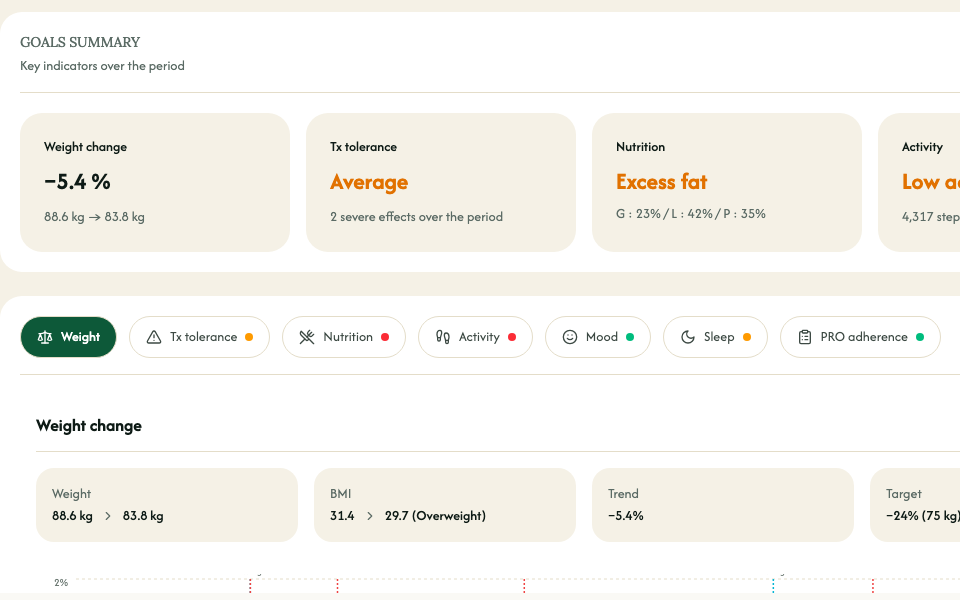 Walk into each visit with a synthesized view of your patient - tolerance, side effects, nutrition, adherence - already structured and ready to discuss.